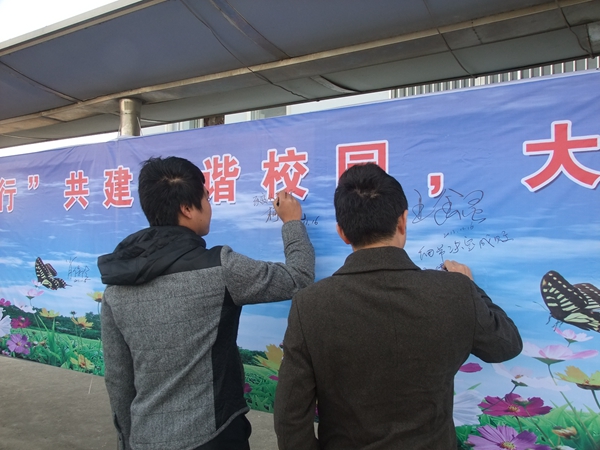 11月16日下午,我校在篮球场举办了“告别陋习,与美同行,共建和谐校园”大型签名活动。全体华夏全校师生都参与了此次签名活动。
