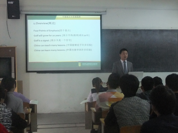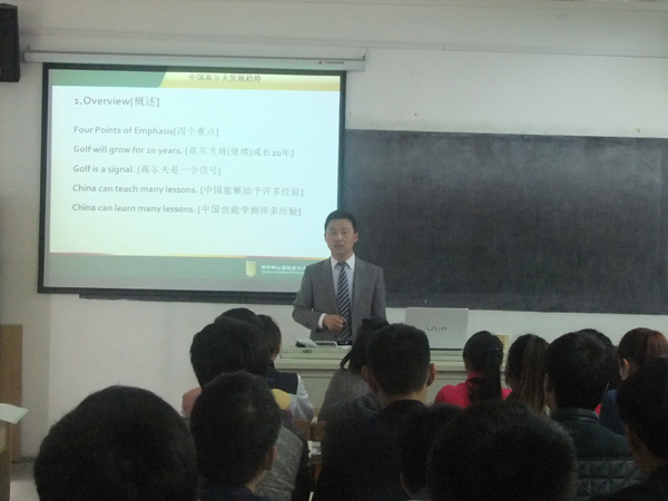周总监向高尔夫专业学生详细分析了高尔夫发展趋势,又从高尔夫从业人员培养上阐述了高尔夫管理、高尔夫职业、高尔夫产业。最后周总监带着对南京钟山高尔夫球场的热爱,展示了球场的实景图、高尔夫业内知名人士练球照片,由此也增强了我校高尔夫专业学生的学习信心。