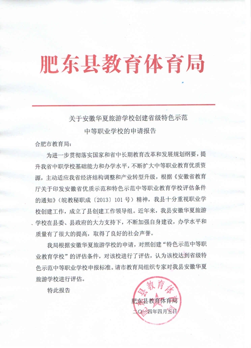关于安徽华夏旅游学校创建省级特色示范中等职业学校的申请报告
