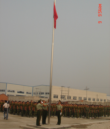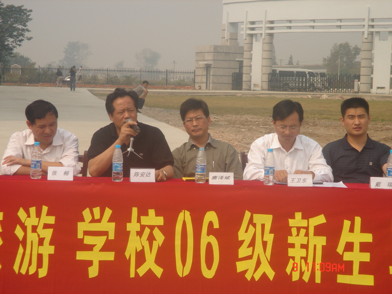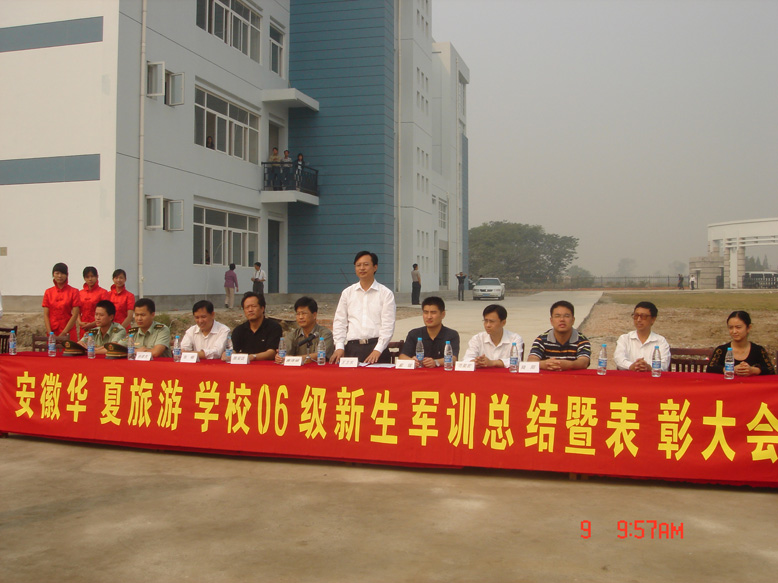 2006年10月9日上午,我校06级新生军训总结暨表彰大会在新校举行,安徽省扶贫办唐泽斌处长、张畅科长,团省委宣传部戴瑞副部长,安徽省旅游局人教处范星宏科长,合肥市旅游局陈安达副局长、管理处陆阳处长及武警部队官兵等出席了大会。图为王卫东校长在大会上讲话
