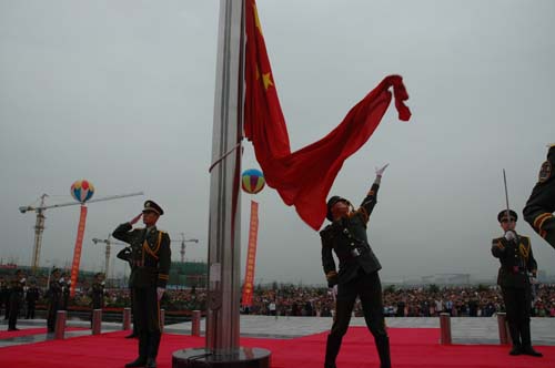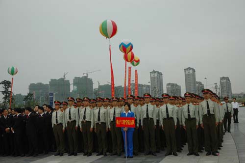 10月1日的市政务中心广场,彩旗飘飘,气球飞扬。庄严的国徽悬挂在市政务中心办公楼正中央,“庆祝国庆”四个大字昭示着今天是共和国的57周年华诞。万余名热情的市民已聚集广场,等候观看升国旗仪式。省市领导孙金龙、吴存荣、黄同文、周富如、董昭礼、陶登松、杜平太、王林建、安列、张晓麟、杨思松、孙家玉、林存安、章义等与到场的市民一起,共同见证这一神圣时刻。