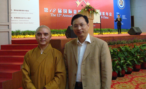 王卫东校长与释果宁法师合影(释果宁法师认为:服务人员要搞好服务,首先应学会从自身的心态修炼开始,养成自己的一颗感恩的心。一切由健康的心态开始,要以爱心来待客,才可能给客人满意加惊喜。)