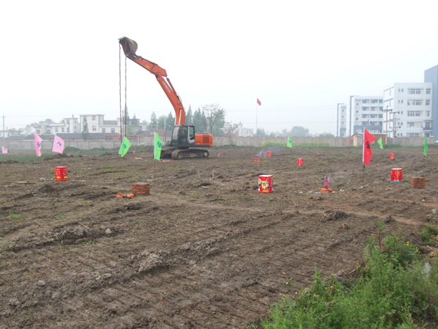 4月14日上午8:38分,我校二期工程施工现场彩旗飘扬,烟花绽放,挖掘机在隆隆的鞭炮声铲出了第一斗土,标志着我校二期工程教学群楼建设正式开工。