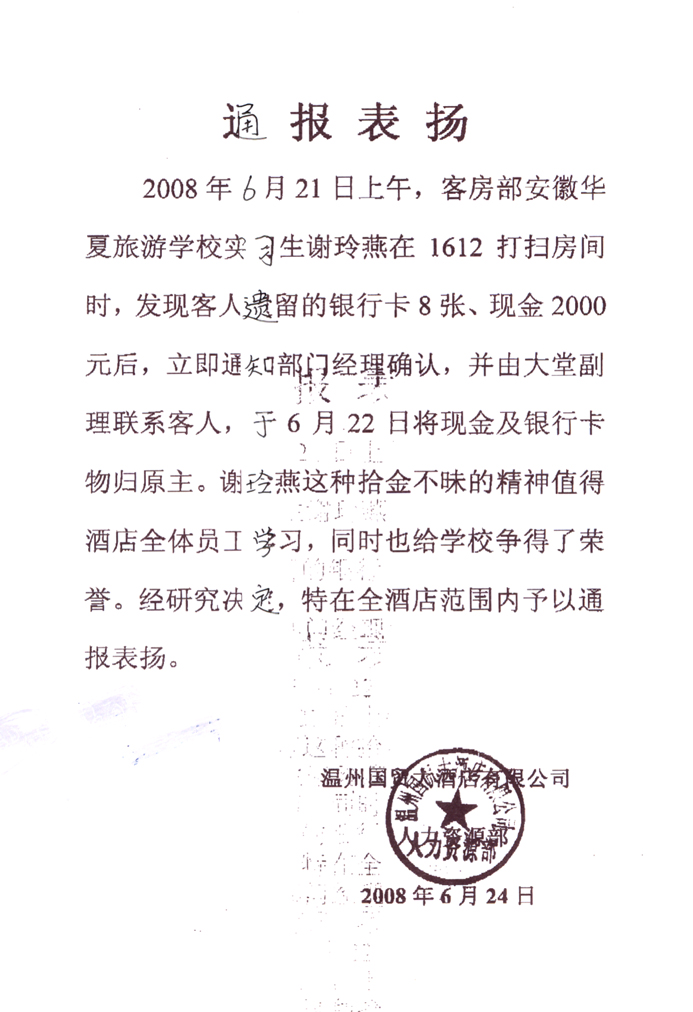 表扬信--温州国贸大酒店发