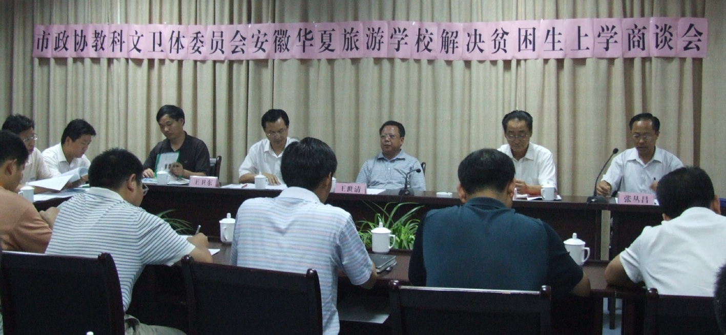 7月23日上午9:30分,六安市政协教科文卫体委员会和安徽华夏旅游学校共商贫困生上学会议在六安市举行。