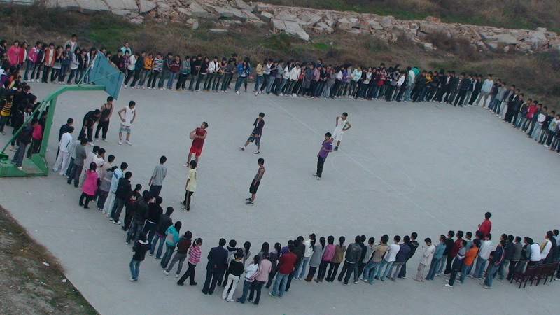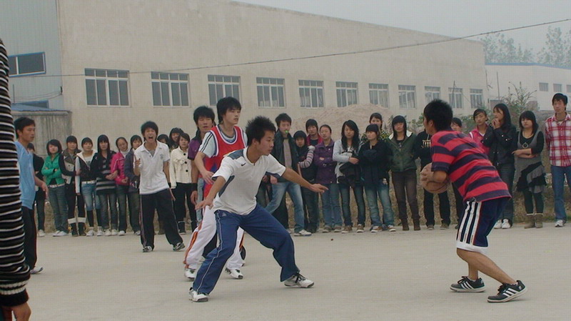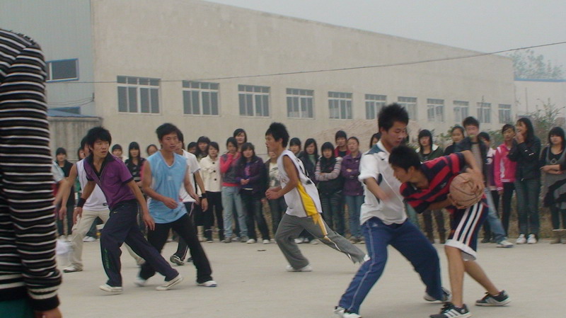 队员们在球场上你争我夺,一轮轮地抢球、投球,动作潇洒。各班学生都来给篮球场上的健儿们加油,其他观赛的同学也为自己支持的队伍加油,此起彼伏的喝彩声,鼓掌声使紧张的赛事轻松了不少。各班组成的啦啦队表演使赛场气氛上更加热烈。