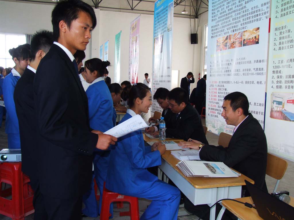 参加今年双选会的毕业生近500人,安徽华夏旅游学校联系了近百家单位,按照发达城市、档次高、信誉好、管理规范的标准,学校认真筛选、谈判并实地考察,从安全、生活、学习、培训、发展空间等角度,选择了北京中奥马哥孛罗大酒店(国际连锁五星)、浙江普陀山祥生洲际酒店(国际连锁五星)、南京华美达怡华酒店(国际连锁四星)、合肥两淮豪生大酒店(国际连锁五星)、合肥泓瑞金陵大酒店(国内连锁五星)、常州金陵江南大酒店(国内连锁四星)、浙江远洲集团宁波远洲国际大酒店(国内连锁五星)和远洲凤凰山庄(国内连锁四星)、台湾海悦集团吴江海悦花园大酒店(国内连锁五星)、苏州金鸡湖号游轮(豪华游轮五星)、安徽国际会展中心、安徽迎驾国际旅行社、合肥植物园等企业,其中国际知名品牌连锁6家,国内集团连锁7家,单体高星8家,共提供岗位800多个。为了让学生更好地了解单位、理性就业,学校在双选会前将企业基本情况、招聘岗位、岗位要求及提供的工资待遇、福利、发展空间、企业文化等信息通过各种途径反馈给学生,同时根据学生选择意向单位发邀请函,再邀请单位来校参加供需见面会,所以学生在双选会上就很有针对性地投了简历,通过与用人单位面对面的接触,接受用人单位的检验,并根据自己的专业、兴趣来选择自己的工作单位。双选会从九点钟开始,不到十一点,学生就全部确定了工作单位,下午就与用人单位签定了合同,效率非常高。