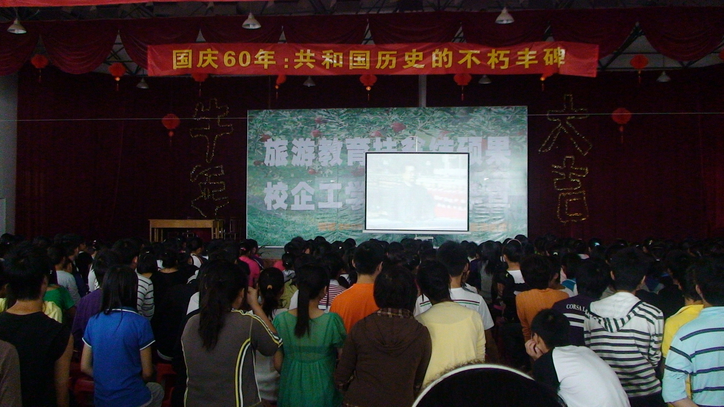 为使广大青年学生深切感受新中国强大的军事实力和综合国力,我校组织2009级近500名学生和老师在校多功能厅集中收看了阅兵大典。大典开始之际,所有学生不约而同地起来,唱起了国歌。观看活动从早上八点开始,一直到中午十二点半,同学们始终激昂亢奋,精神勃发,精彩之处,掌声不断。