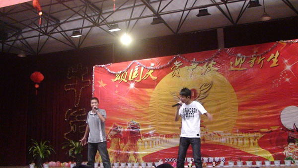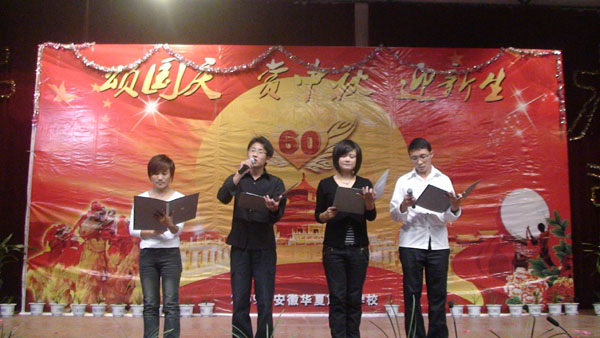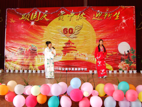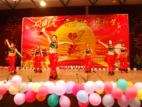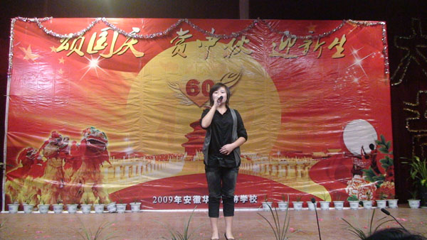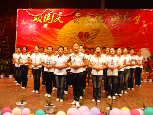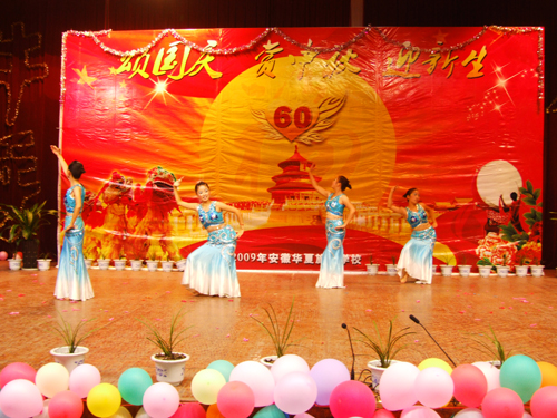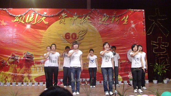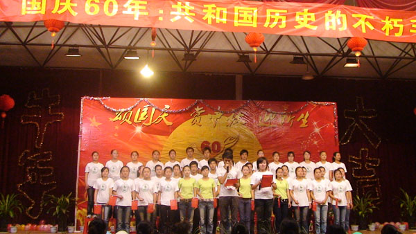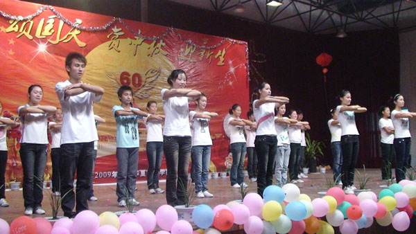 2009年国庆旅游实践活动报道之四   我校隆重举行“颂国庆赏中秋迎新生”文艺晚会       今天是国庆长假的第三天,又是传统的中秋佳节,我校2009级500名新生和老师欢聚一堂,校多功能厅灯光璀璨、掌声阵阵,校学生处主办,学生自编自演的“颂国庆、赏中秋、迎新生”文艺晚会在这里举行。刘兆喜副校长在晚会上致辞,他代表学校向全校师生员工致以节日的祝贺和亲切的问候。他说,新中国成立六十年来特别是改革开放以来,我们国家发生了翻天覆地的变化,取得了举世瞩目的成就。伴随着共和国前进的步伐,勇于开拓,学校的办学规模不断扩大,办学水平不断提升,我们坚信,在全体师生的共同努力下,学校明天一定更加美好,祖国的未来更加美好! 晚会由舞蹈《好日子》拉开了帷幕,大合唱《我和我的祖国》、现代舞《精舞门》、诗朗诵《献给祖国的一首诗》和具有民族风情的傣族舞《有一个美丽的地方》等精彩节目令观众目不暇接,现场不断响起热烈掌声。晚会在齐唱《明天会更好》中落幕。整台晚会节目丰富多彩,充分表达了师生们对祖国的热爱。(管二妹报道)