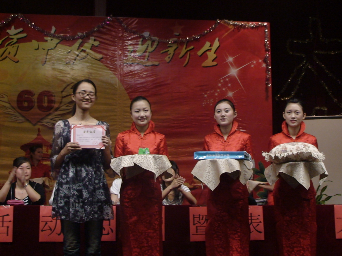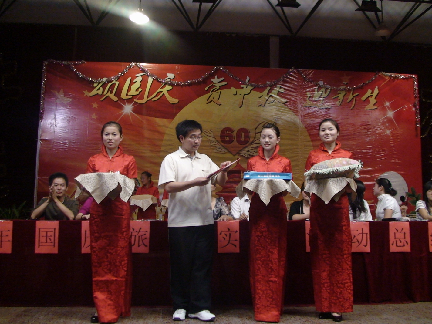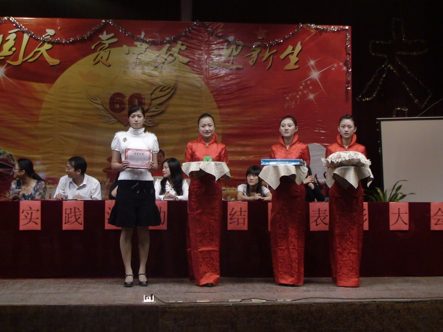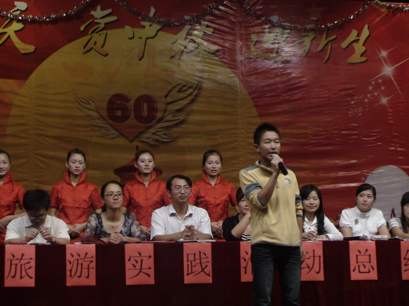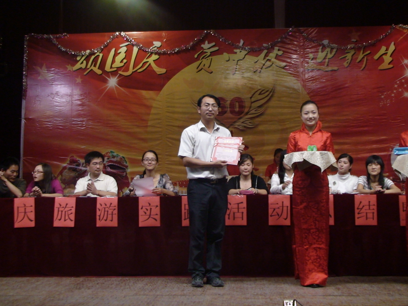 首先苏长兵副校长对八天的国庆旅游实践活动作了全面的回顾和总结,分析了我校开展本次国庆旅游实践活动的原因和现实意义。他说,今年的国庆意义非同一般,既是国家60周年大庆,又赶上中秋佳节,也是我们同学来校的第一次大型旅游实践活动,学校认真策划了本次活动。事实证明,本次活动是学校历史上举办旅游实践活动内容最丰富的一年。这次活动让一大批同学脱颖而出,有甘于奉献的,有拾金不昧的,有助人为乐的,有顽强拼搏的,等等;活动也让班级的凝聚力得以加强,让每一个人的班级荣誉感得以升华。今晚隆重举行颁奖仪式,是对本次活动的一个完美总结,本次活动至此取得圆满成功。最后,他感谢学生处和班主任老师为本次活动所付出的努力。