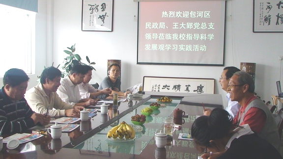 10月22日合肥市民政局副局长王世豪、王大郢党总支副书记王世坤等领导来我校指导科学发展观学习实践活动。我校是合肥市民政局学习科学发展观实践活动对口联系单位之一。