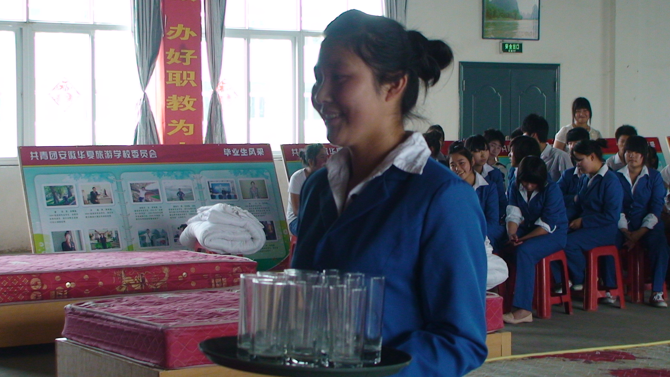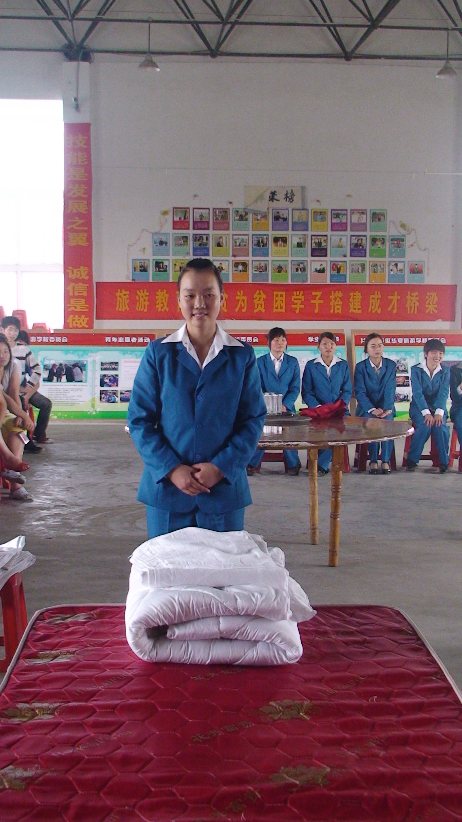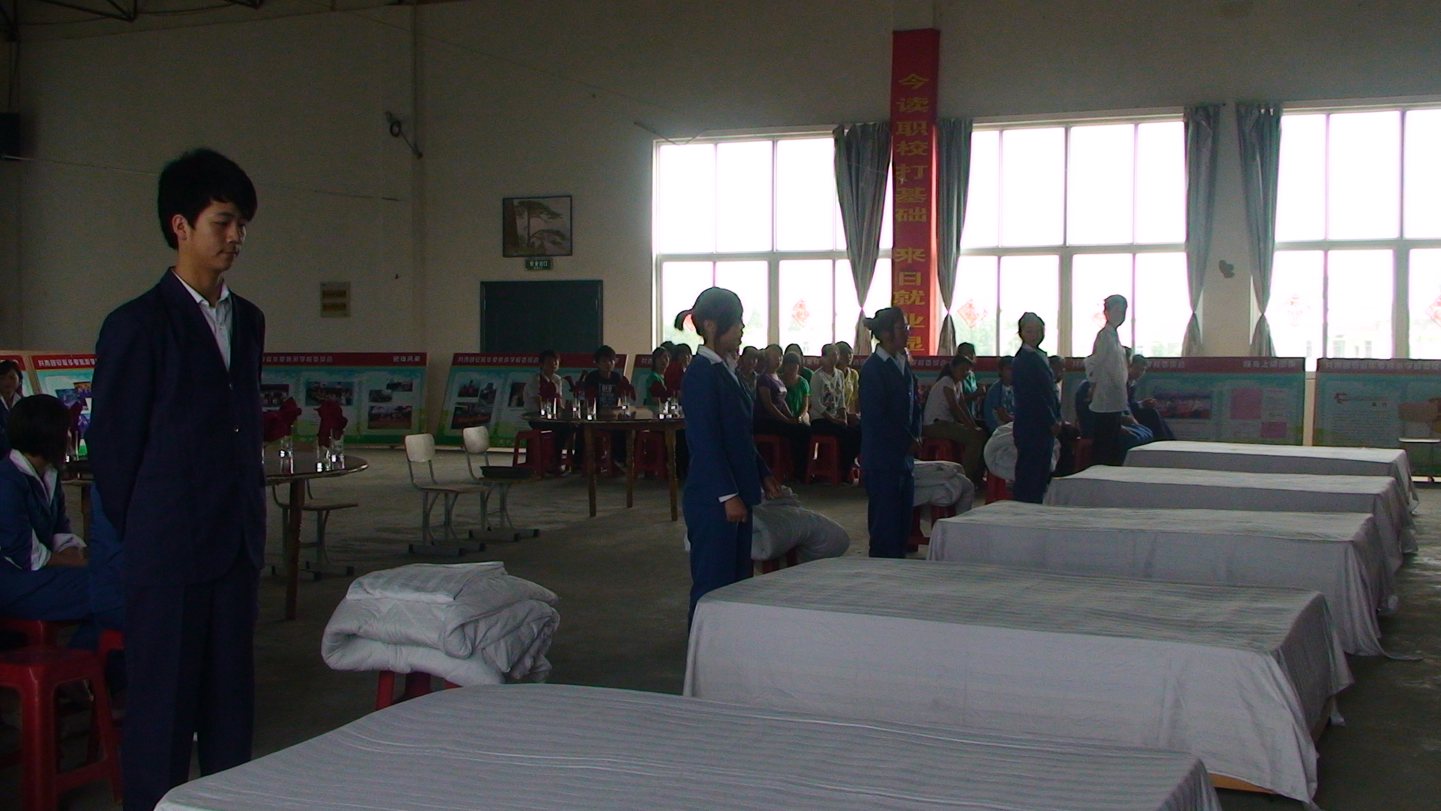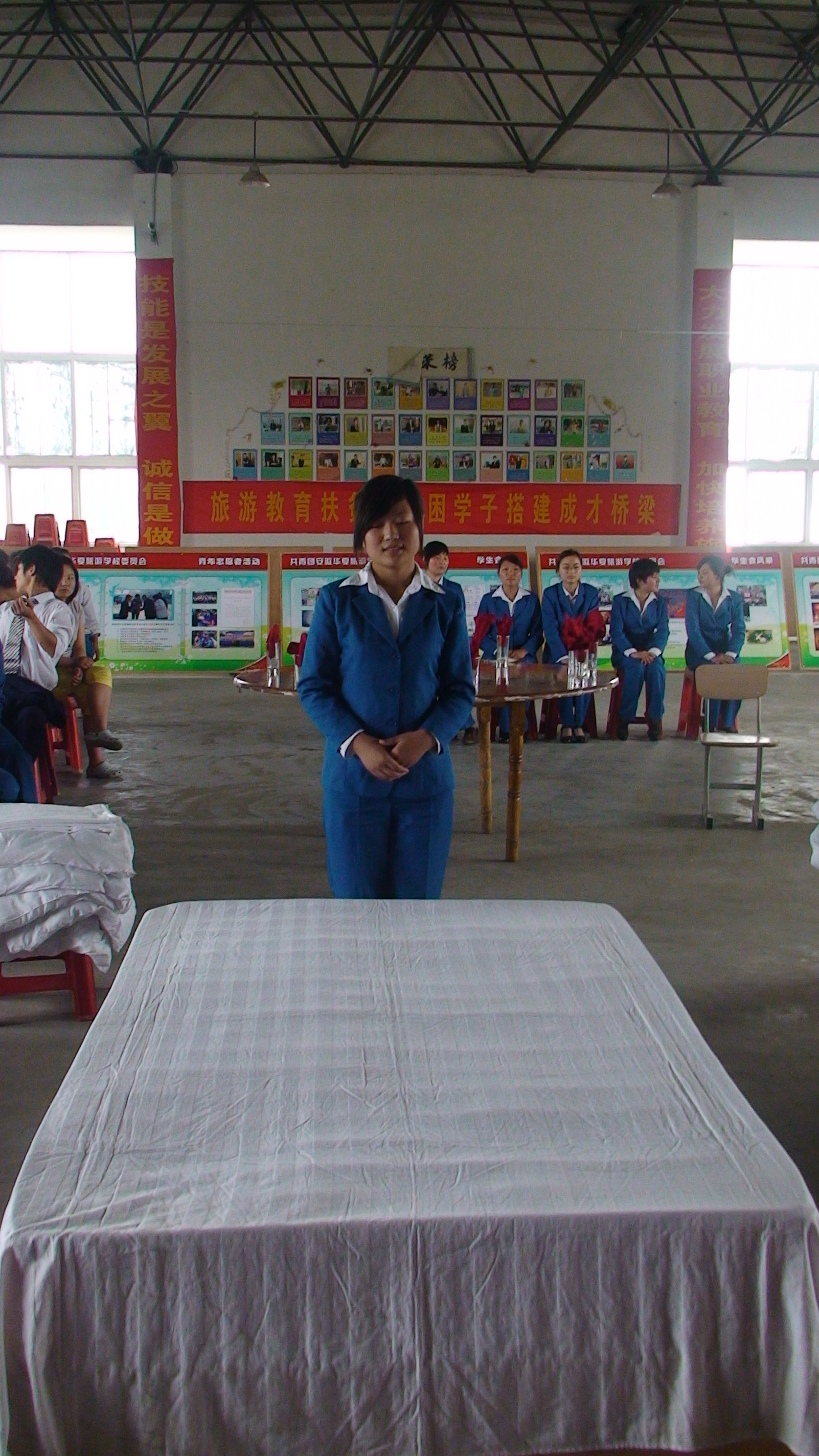 5月29日下午,我校2010年饭店服务技能大赛在多功能厅隆重举行。09级各班级认真遴选确定参赛选手,积极参加了客房服务的甩单、包边包角、套被套,餐饮服务的礼仪、餐巾折花、托盘等六个项目的比赛。经过激烈的竞争,先后确定了六个项目的前三名,同时,中专二班获得优秀组织奖、春招班获得积极参与奖。