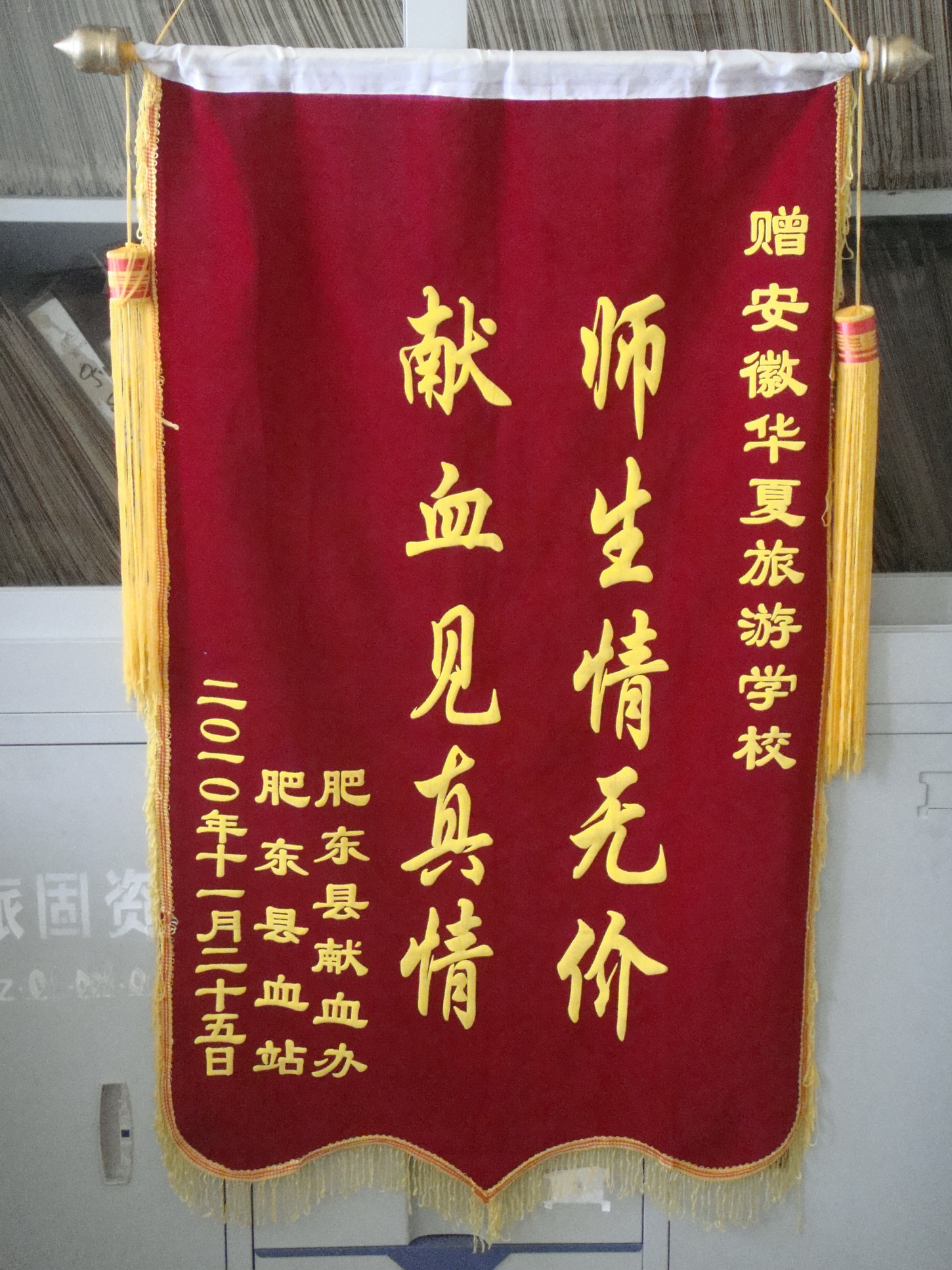 师生的爱心行动深深感动了肥东县献血办公室的领导和九名工作人员,他们专门来到学校学生处,为我们师生赠送一面“师生情无价,献血见真情”的锦旗。(学生处)