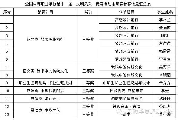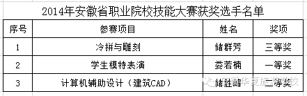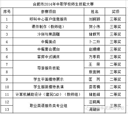 在合肥市2014年中职学校师生技能大赛、第十一届全国中等职业学校“文明风采”竞赛活动和“神州视景杯”第六届全国旅游院校服务技能(导游服务)大赛中,安徽华夏旅游学校全体师生经过层层选拔,不懈努力,最终获得前所未有的佳绩。