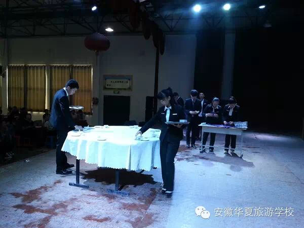 影视作品展示完之后,紧接着便是前六名的风采展示。拉票环节。前六组的同学们可以说为了荣誉也是拼了,就拿1组来说吧,他们把学校中餐实训教学用品搬来进行风采展示,小组每一位成员分工明确,在短短的两分钟内摆出八人位的中餐摆台,展示出自己优秀的专业技能。