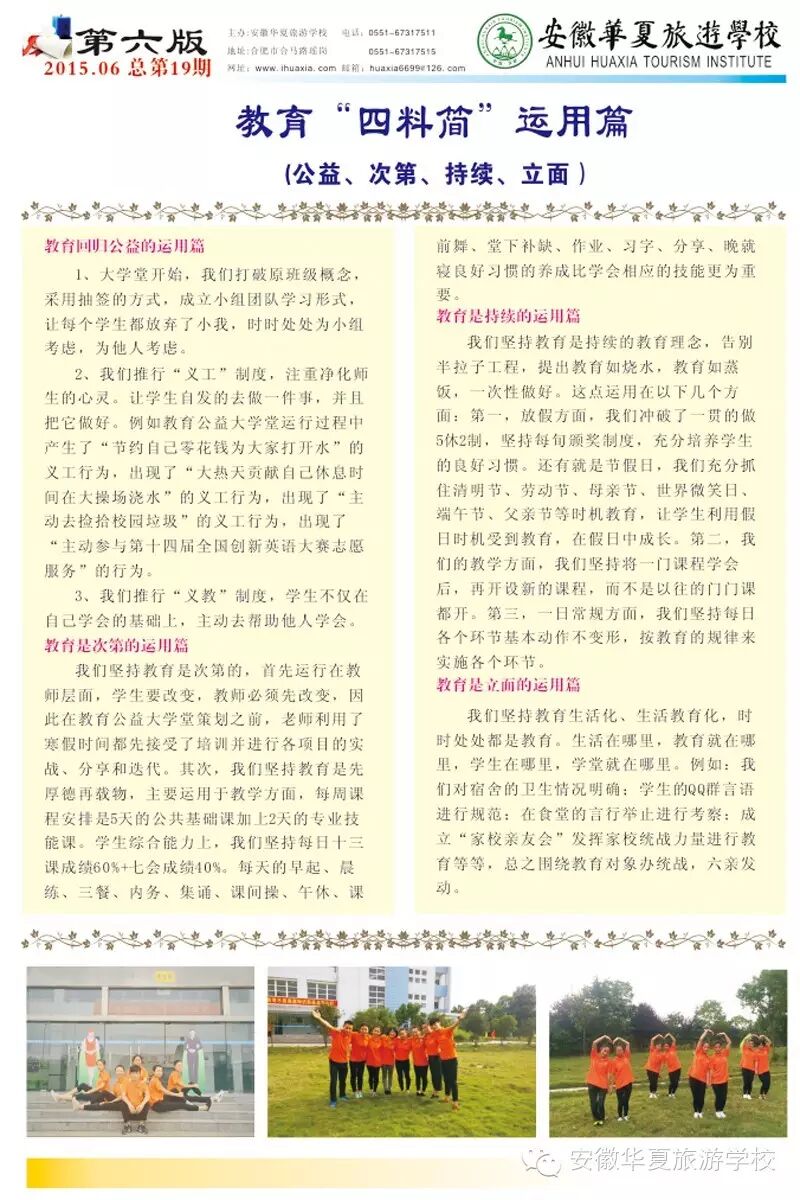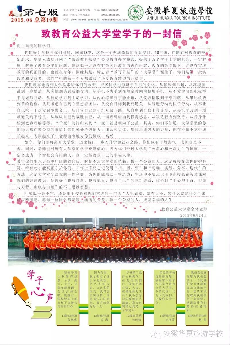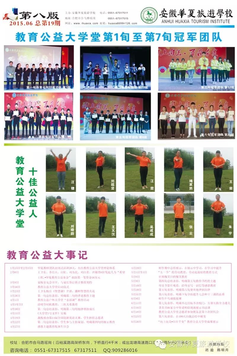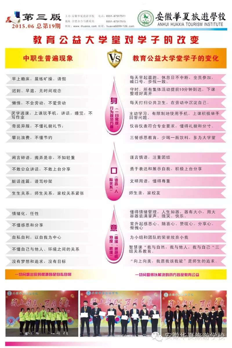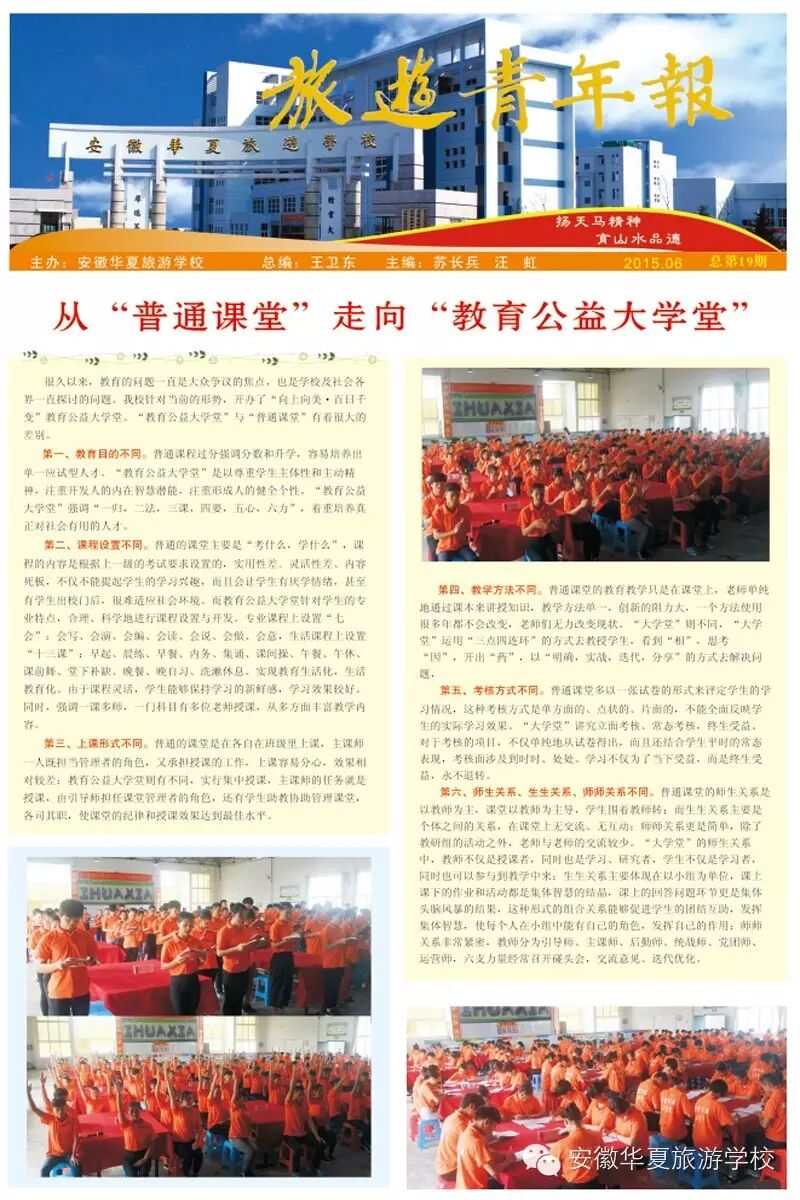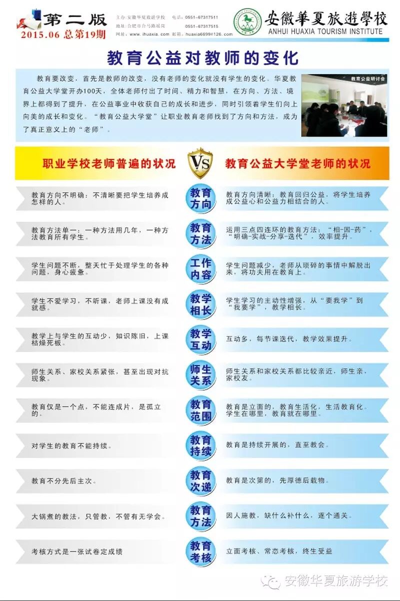 从公益教育到教育公益——2015年开始,安徽华夏旅游学校着力搭建全国较大较好的O2O教育公益平台,提出“一个回归、两种方法、三类课程、四大机要、五颗初心、六支力量、十八荣耻”,总结堂上教育教学纲要(主课教育七会)和堂下教育教学纲要(生活教育十三要),并开办“教育公益大学堂”,将教育公益理念付诸实践。