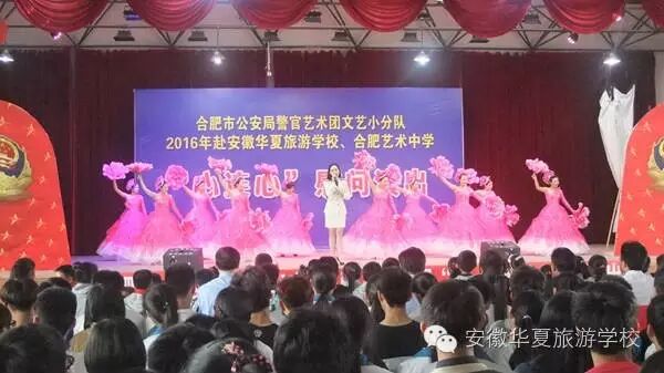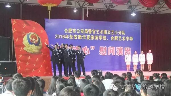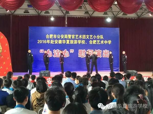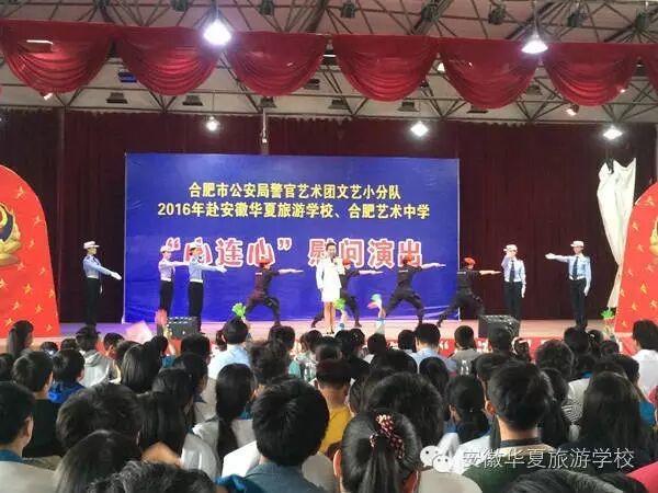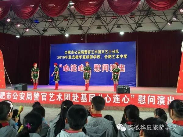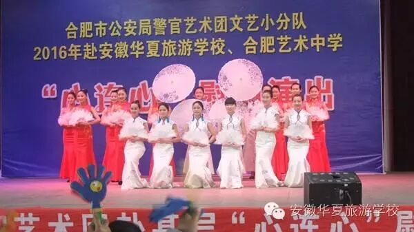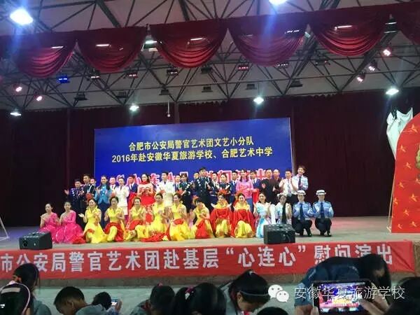 为纪念建党95周年和红军长征胜利80周年,不断推进全市公安机关警营文化建设,向基层民警传递市局党委的关怀和慰问,2016年5月23日下午,合肥市公安局警官艺术团文艺小分队“心连心”下基层慰问肥东县专场演出,在安徽华夏旅游学校举行。