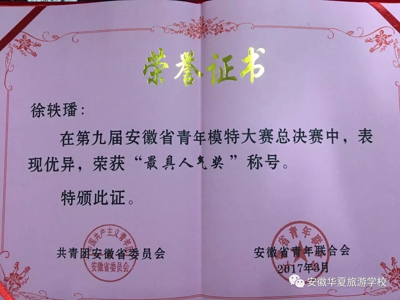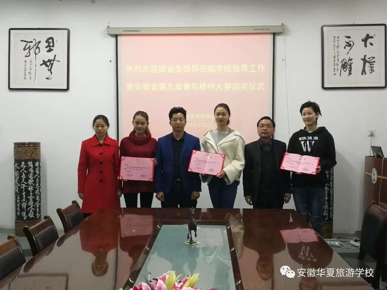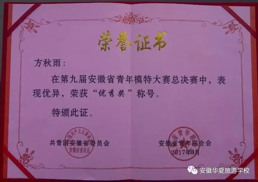 2017年3月30日,安徽团省委领导、安徽省青年模特大赛组委会领导莅临我校指导工作并举行安徽省第九届青年模特大赛颁奖仪式。安徽华夏旅游学校共有3人进入全省决赛,均获得佳绩。徐轶璠同学荣获“最具人气奖”称号、母皖溪和方秋雨两位同学获得“优秀奖”;学生技艺精湛,也离不开老师的精心指导,安徽华夏旅游学校徐楠楠老师也受到安徽省青年模特大赛组委会的认可,被授予“优秀指导教师”称号;同样,本校也因在安徽省第九届青年模特大赛中积极组织,成绩显著,被授予“优秀组织奖”称号。