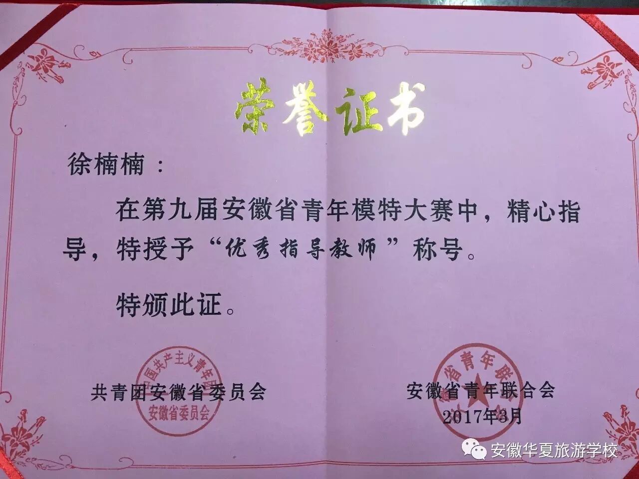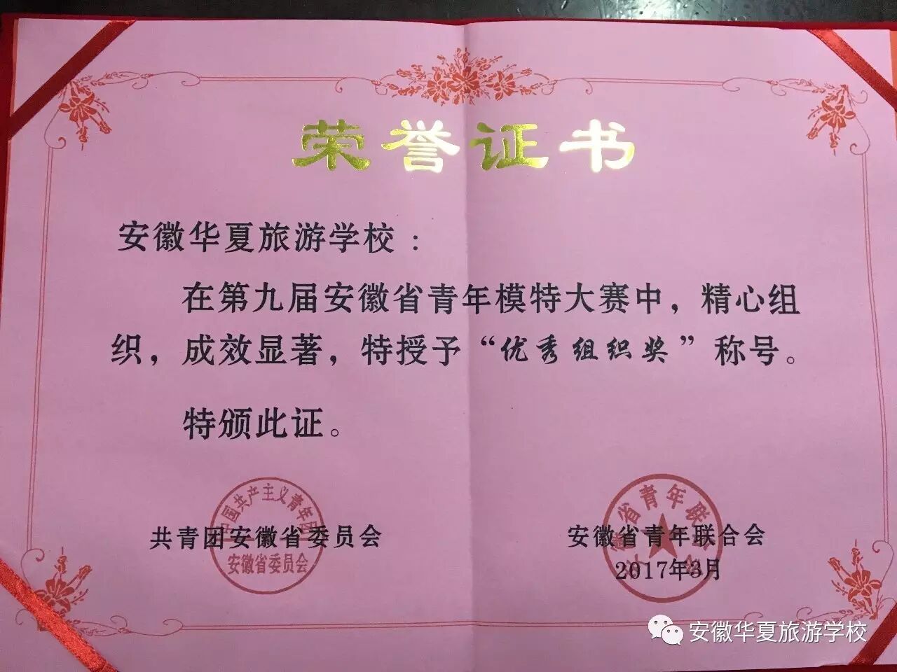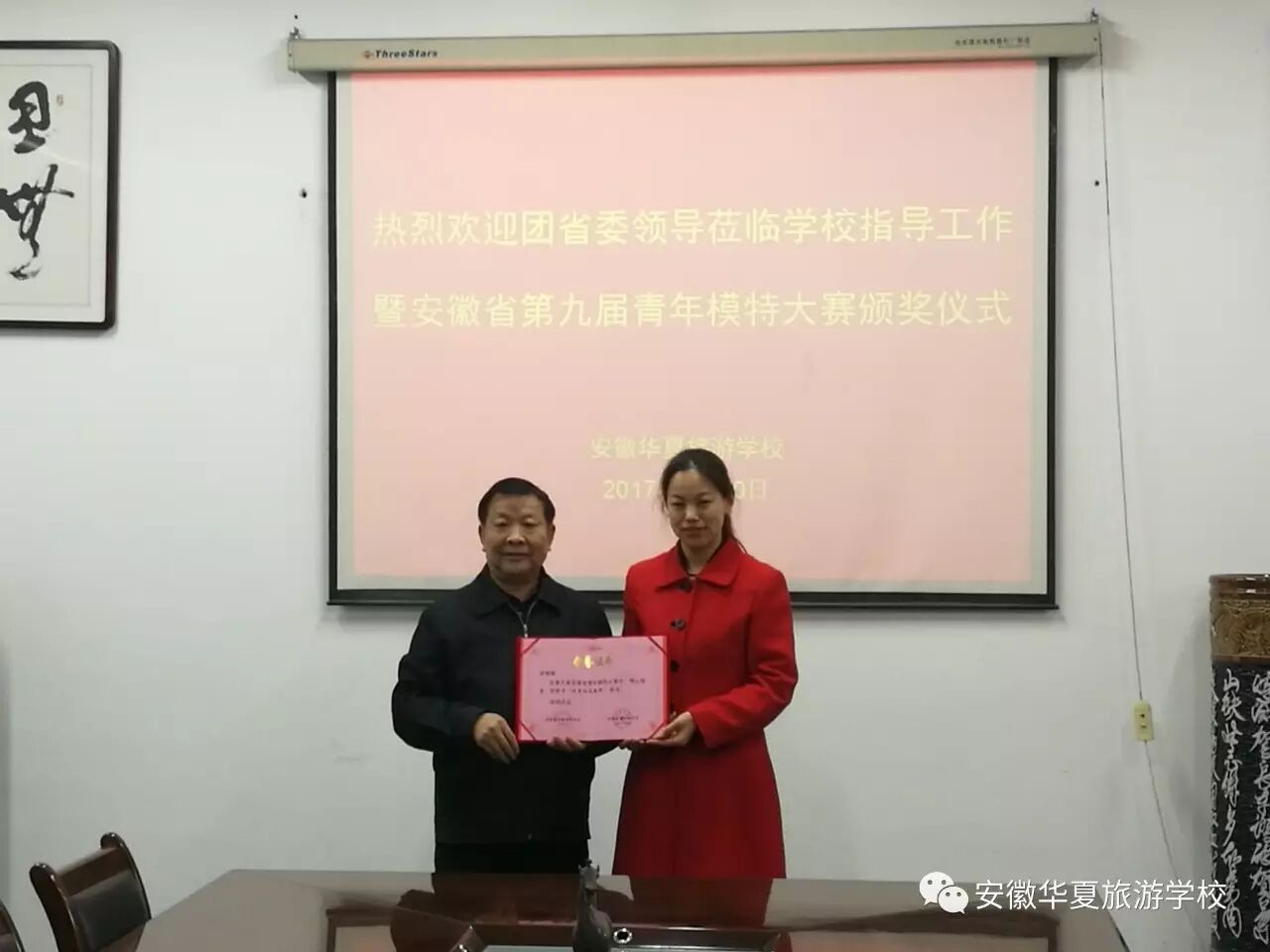 2017年3月30日,安徽团省委领导、安徽省青年模特大赛组委会领导莅临我校指导工作并举行安徽省第九届青年模特大赛颁奖仪式。安徽华夏旅游学校共有3人进入全省决赛,均获得佳绩。徐轶璠同学荣获“最具人气奖”称号、母皖溪和方秋雨两位同学获得“优秀奖”;学生技艺精湛,也离不开老师的精心指导,安徽华夏旅游学校徐楠楠老师也受到安徽省青年模特大赛组委会的认可,被授予“优秀指导教师”称号;同样,本校也因在安徽省第九届青年模特大赛中积极组织,成绩显著,被授予“优秀组织奖”称号。