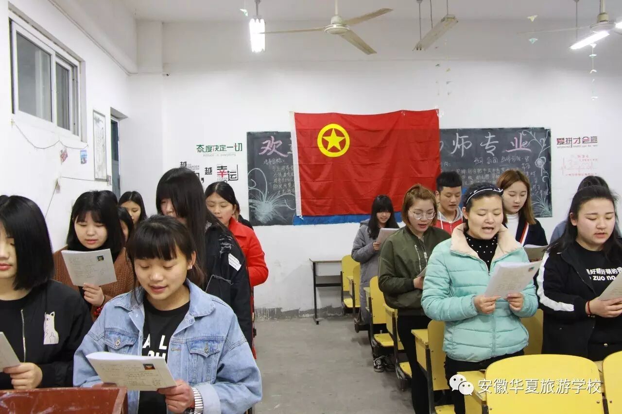 2017年3月31日晚上,安徽华夏旅游学校校团委在102教室举行了2017年度第一批次少年团校结业典礼暨入团仪式。大会在庄严的国歌声中拉开帷幕。