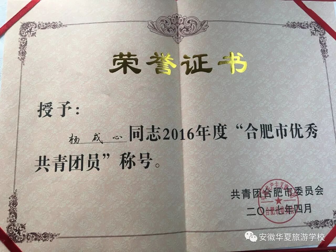 近日,安徽华夏旅游学校姚新愿、杨成心两位同学荣获2016年度“合肥市优秀共青团员”称号。