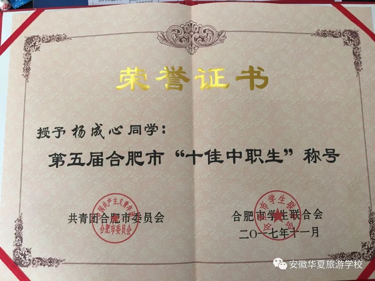 2017年11月,安徽华夏旅游学校王雪、杨成心两位同学分别被授予2017年度合肥市“最美中职生”、“十佳中职生”称号。