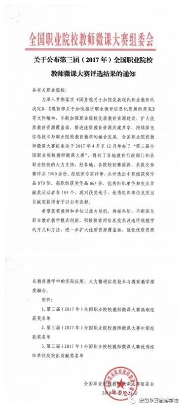 在2017年第三届全国职业院校教师微课大赛中,肥东县中等职业学校共计获奖28人,安徽华夏旅游学校共计15人获奖,其中陈灿老师荣获二等奖,杨保宁、王玉婷、邢丹丹、严海珊等4位老师荣获三等奖,张成、赵雅新、郭月敏、汪琳子、翁梦、贺小伟、夏蕾、徐小芳、吴越、毕智超等10位老师荣获优秀奖