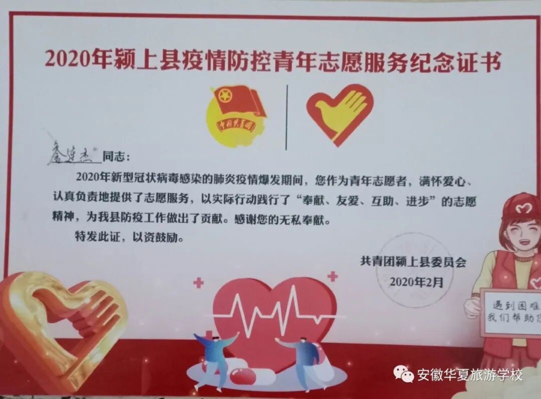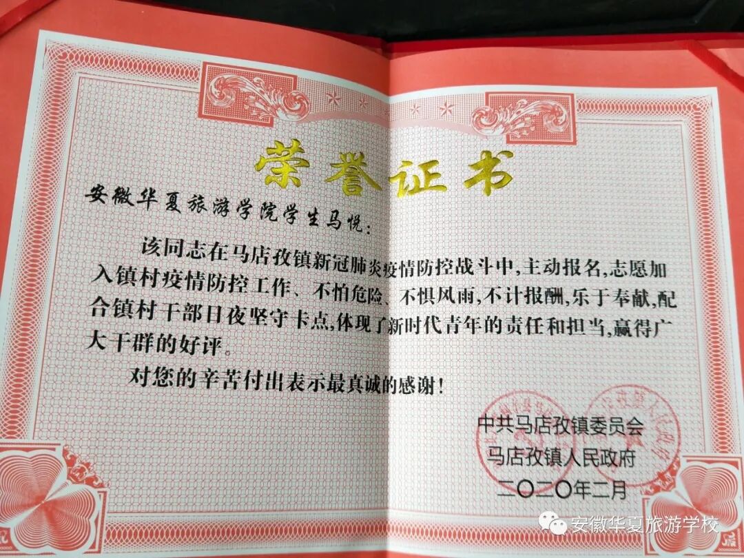 当前,新冠肺炎的疫情防控工作正在深入开展,各省市县镇始终贯彻“疫情就是命令,防控就是责任”的工作要求,坚持高站位、严举措、细防护抓好各项防疫控疫措施落地落实,涌现出许多优秀的战“疫”先锋。安徽华夏旅游学校2017级城市轨道交通运营与管理专业的马悦同学、2018级汽车运用与维修专业的詹俊杰同学,都在此次疫情中受到当地政府的表彰。