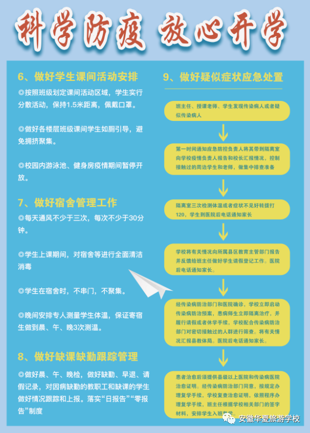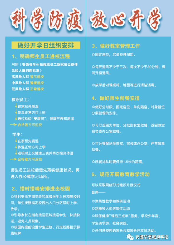 自新型冠状病毒疫情发生以来,安徽华夏旅游学校严格按照各级各部门防疫工作要求,成立防控领导小组,及时摸排师生情况,并向广大师生宣传防疫知识。下一阶段,我校将按照检查组的反馈意见,抓实疫情防控措施,不放松疫情期间的各项工作,进一步完善并做好开学前的各项预案,确保校园安全、师生安全。