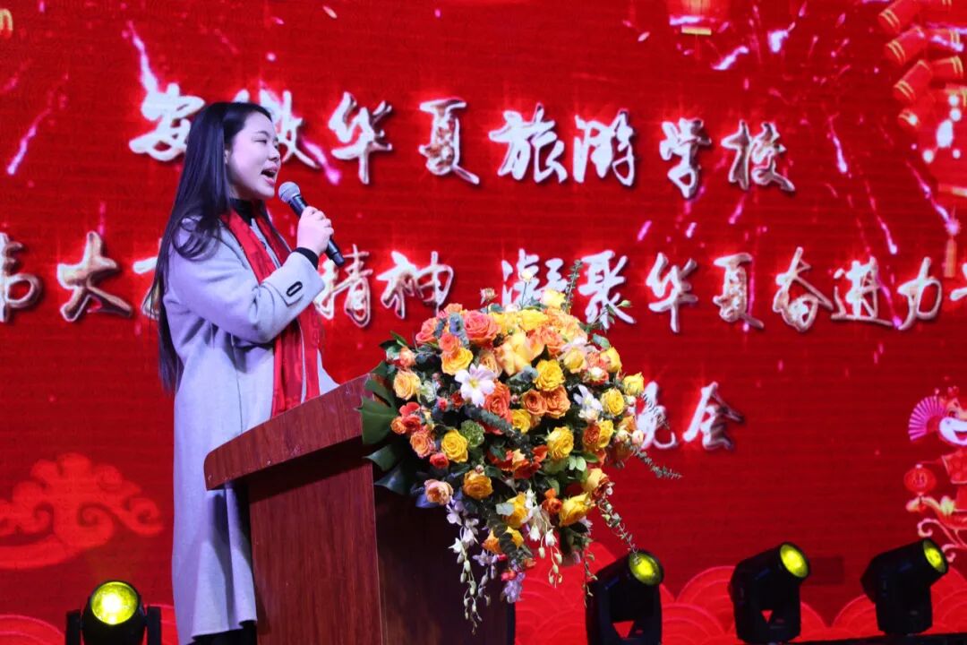 全校领导和师生欢聚一堂,载歌载舞,共同谱写属于华夏的新年华章。晚会伊始,安徽华夏旅游学校执行校长彭慧娟作新年致辞。她代表学校向兢兢业业、辛勤工作的全校教职工,向刻苦学习、健康成长的莘莘学子,向长期关心、支持、呵护学校发展的各界领导和朋友致以最诚挚的问候和最美好的祝愿。