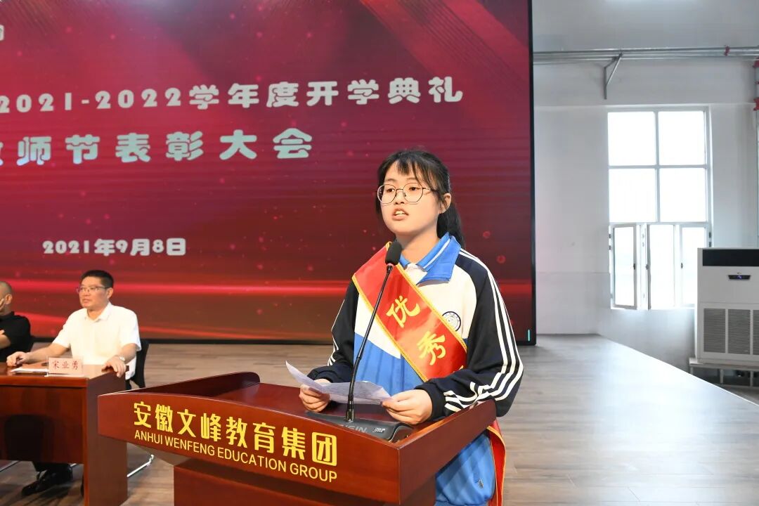 教师代表骆启培作表态发言。他表示全体教师在新学年里依然会本着文峰“寻找闪光点,追求最大值”的育人理念,敬业务实,开拓进取,立足三尺讲台,向课堂教学要效率,向培优转差要质量。努力做到关心爱护每一个学生,力求做到爱与严紧密结合,以严导其行,以爱温其心,积极与学生加强情感交流,教书育人,管理育人,改进教法,团结协作。在新的学年,新的起点,以新的姿态,新的干劲,展示新的风采。