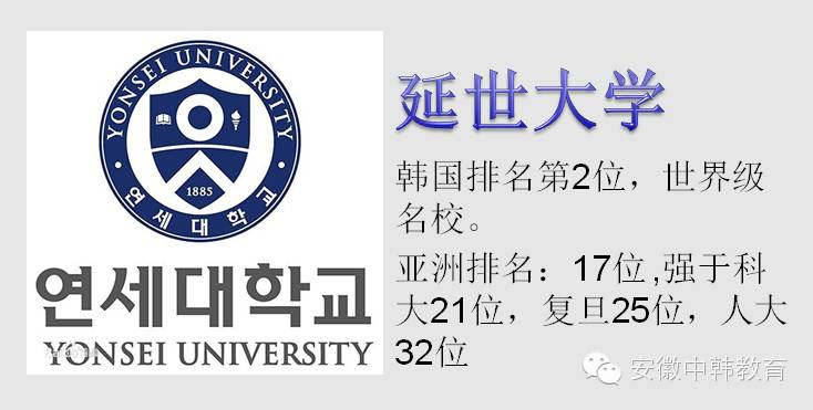 延世大学(韩语:?????,英语:Yonsei University)创立于1885年,是一所以基督教精神为准则而设立的高等学府,是韩国大学中历史最悠久的大学。延世大学在韩国作为最有领导力的高等学府以悠久的历史以其国际化的声誉而闻名,与首尔大学、高丽大学并称韩国三大超一流大学(S.K.Y)。2011年,该校在QS世界大学排名中排名142,在亚洲排名18。 泰晤士高等教育世界大学声誉排名第190。2008年,在法国国立巴黎高等矿业学校(EMP)基于各校毕业生在《财富》杂志发布的世界500强企业中担任首席执行官的人数指标进行的世界大学排名中列第89位。