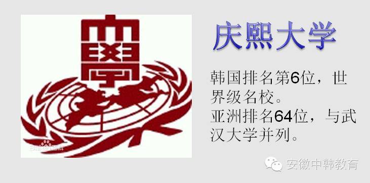 庆熙大学是韩国知名的私立高等学府,创立于1949年,是韩国三大私立名校之一。现有三个校区(分别位于首尔市东大门区,京畿道龙仁市和京畿道南杨州市)及二十多个系科,并设有庆熙网络大学,具备从幼稚园到研究生院的综合教育体系。学校与51个国家193所大学建立了交流合作关系,庆熙大学曾多次被选为韩国最优秀大学,联合国秘书长安南和韩国总统金大中是该大学的荣誉博士。1999年被评为韩国学生最渴望入读的学校。