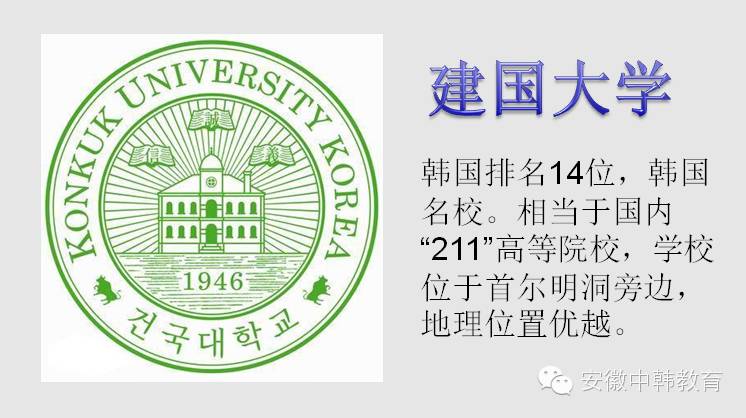 建国大学(?? ???)是韩国著名的私立大学,创建于1946年,总校位于韩国的首都首尔,在忠州市设有分校。 建国大学自1998年起,建国大学外语学院开始向旅韩的外籍人士提供韩国语课程,其目的是帮助外国人更好地了解韩国文化,深入韩国的社会生活。为了满足中韩两国经济,文化交流与合作的需要,专门开设跆拳道、书法、电脑、韩国歌曲、韩国语课程。