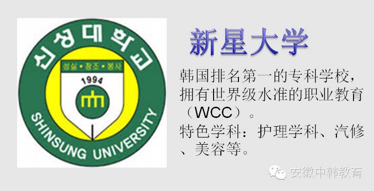 新星大学校是韩国教育部指定的优秀大学,是一所以工为主,集文、理、工、医为一体的综合大学。学校座落于韩国中西部的忠清南道,占地595000平方米,依山傍水,环境优美。学校管理体制健全,师资力量雄厚,在校师生5000余人。共设有16个专业的5大学科系列,及15个系。