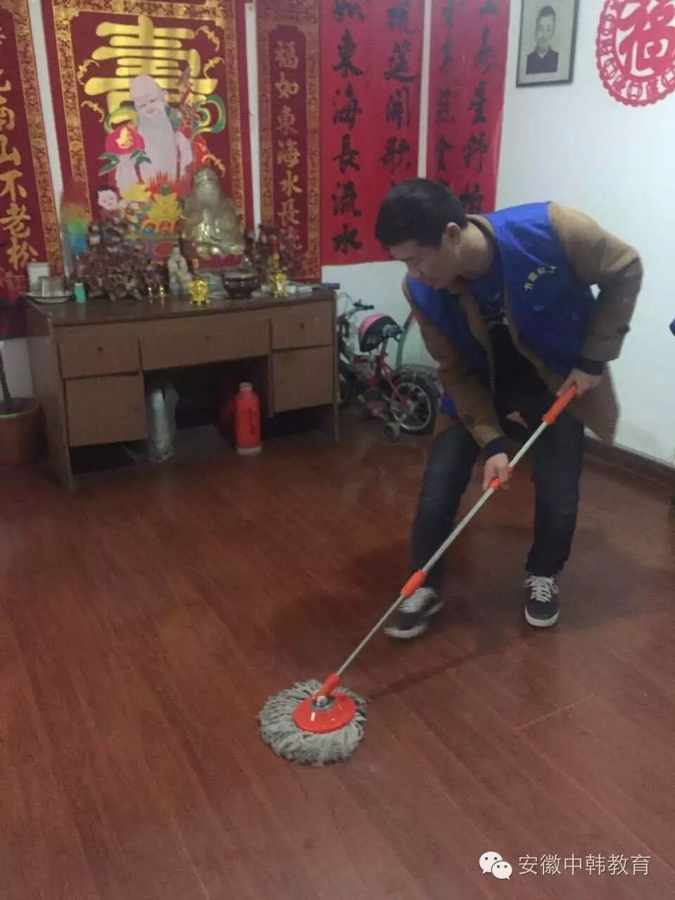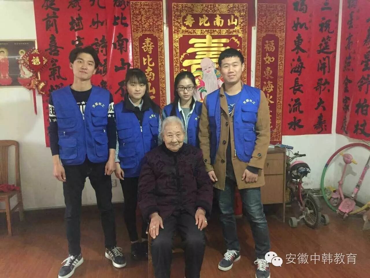 其他同学迅速分成四个小组,由自己推选出来的组长带领,前往四位老人的家中,为老人打扫卫生、整理房间,陪老人说话、聊天。