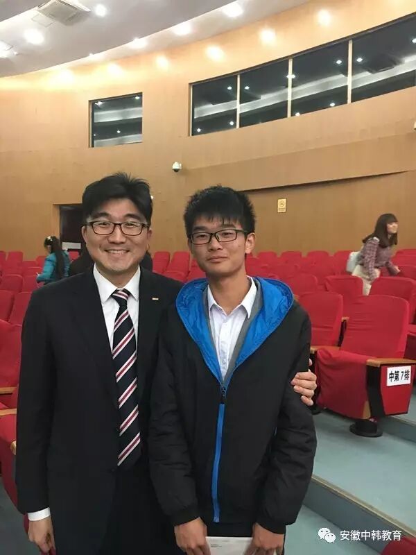 颁奖典礼结束后,韩国顺天乡大学国际教育交流处处长、医学博士柳炳旭先生主动找到杨化兵同学合影。他深情的说:“??? ???? ?????.(谢谢你能来参加这次比赛)!”