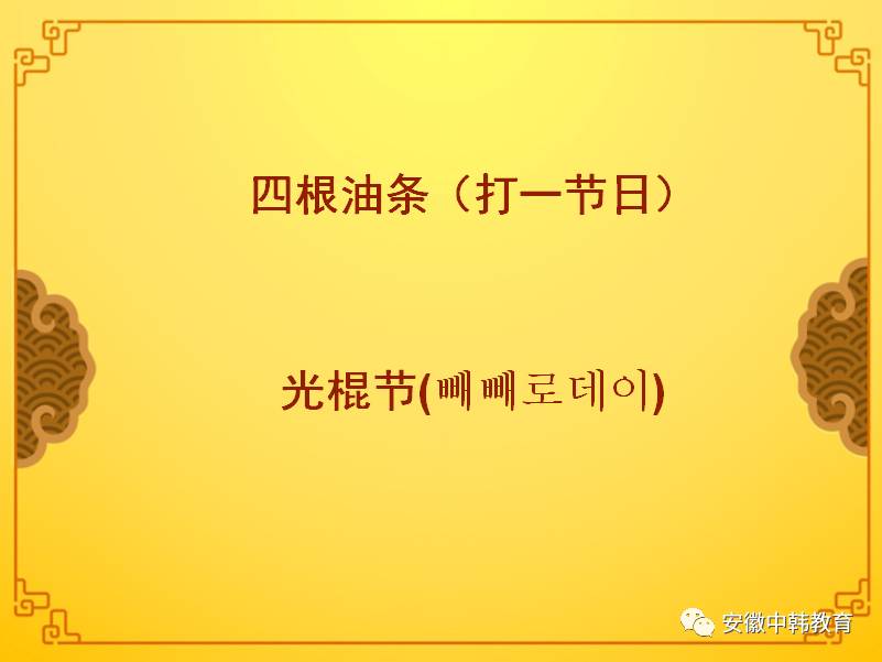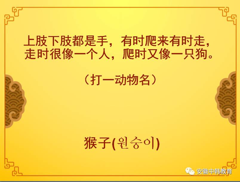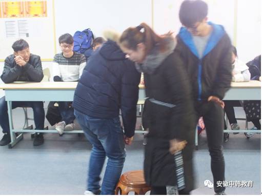 活动分为两个环节,第一环节就是用韩语猜灯谜。班级同学按照小组PK方式进行,为抢得答题机会,我们用游戏“抢凳子”的方式,各组派一位队员上台,跟着音乐节奏绕着凳子走,音乐停时坐到凳子上即为抢得答题机会。抢到凳子只是猜灯谜的开始,当题目出现,抢到凳子的小组必须在3秒钟内猜出答案,而且要用中文、韩文同时说出,如果超出3秒未答出,其他组可以举手起立抢答。现场气氛火热,大家抢得开心,答得也很开心。