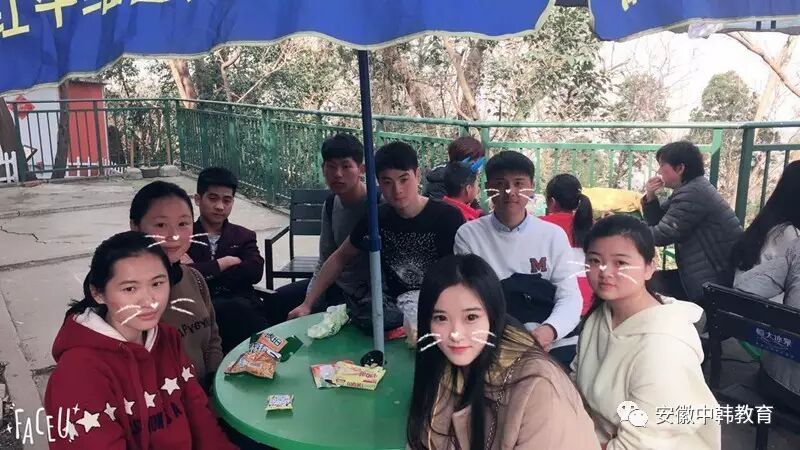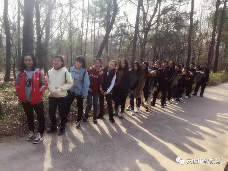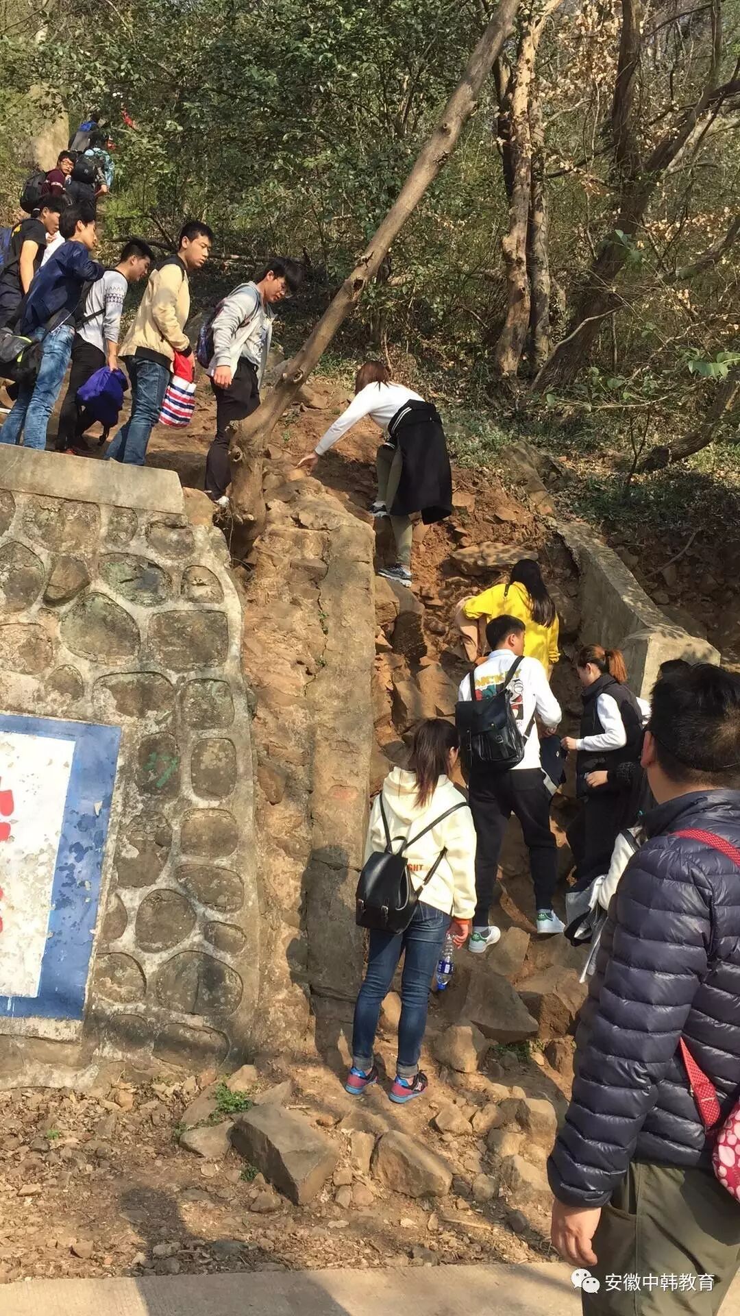 早上八点,中韩班全体师生满怀欣喜地出发了,阳光明媚,道路也畅通无阻,我们很快就到了大蜀山脚下。停歇片刻,我们就开始爬山啦!我们中韩班的学生没有选择平坦的大道,而是挑战了崎岖不平的山路。途中偶遇的台阶是那么陡峭,每一步都需要他们自己去跨越,但我们中韩班没有一个人掉队落伍,越是难走的路,越不退缩。