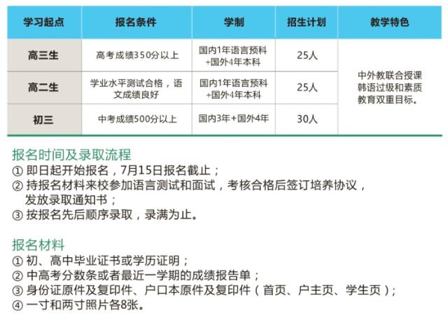 初中起点,采用3+4七年制本科班培养模式: 初三毕业生达普通高中录取分数线,在合肥艺术中学学习3年高中文化课程和韩语课程,直升韩国4年本科大学。