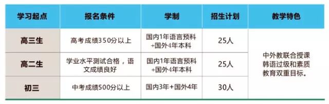 初中起点,采用3+4七年制本科班培养模式: 初三毕业生达普通高中录取分数线,在合肥艺术中学学习3年高中文化课、韩语课及素质课程,直升韩国4年本科大学。