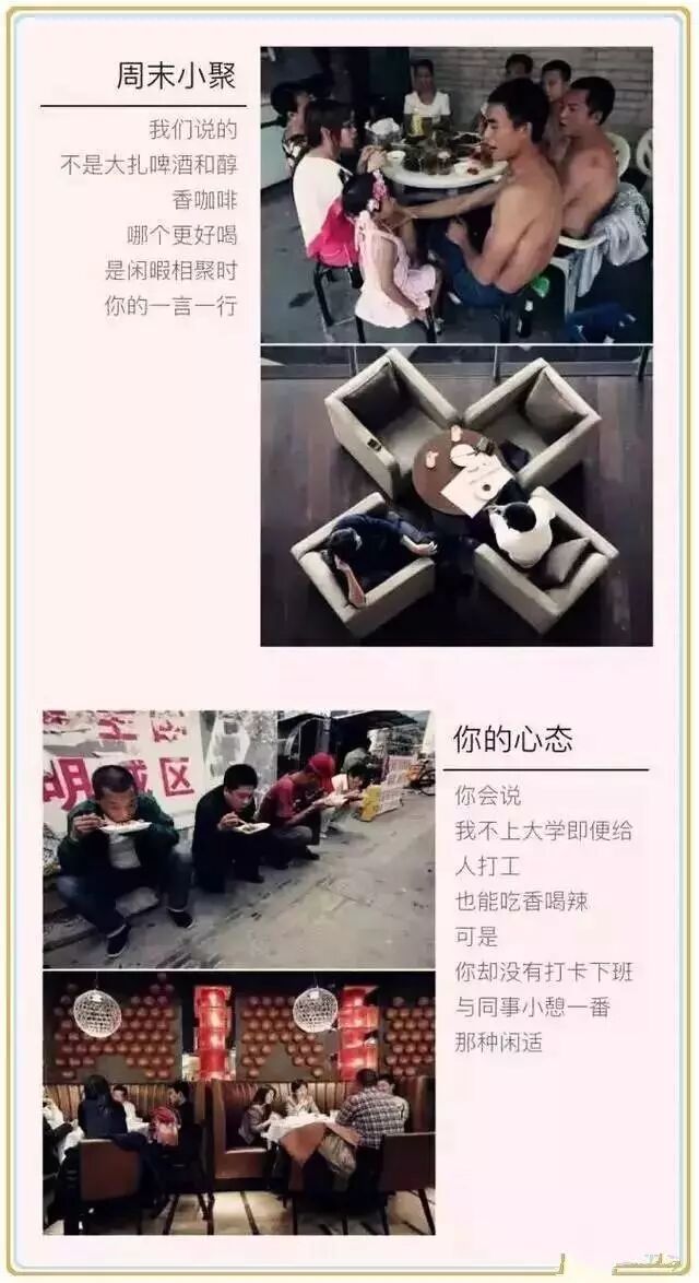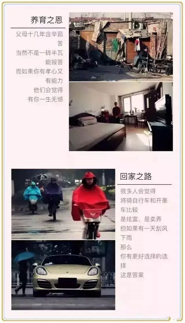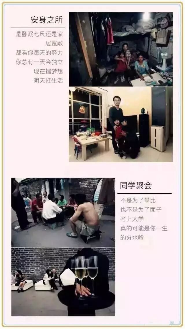 当你抱怨自己已经很辛苦的时候,请看看在西部的那些穷孩子,他们饭吃不饱,衣穿不暖,冻着脚丫,啃着窝窝头的情形;请想一想几十年如一日起早贪黑的老师们;请你对比一下那些透支着体力却依旧食不果腹的打工者,还有你们的爸妈!
