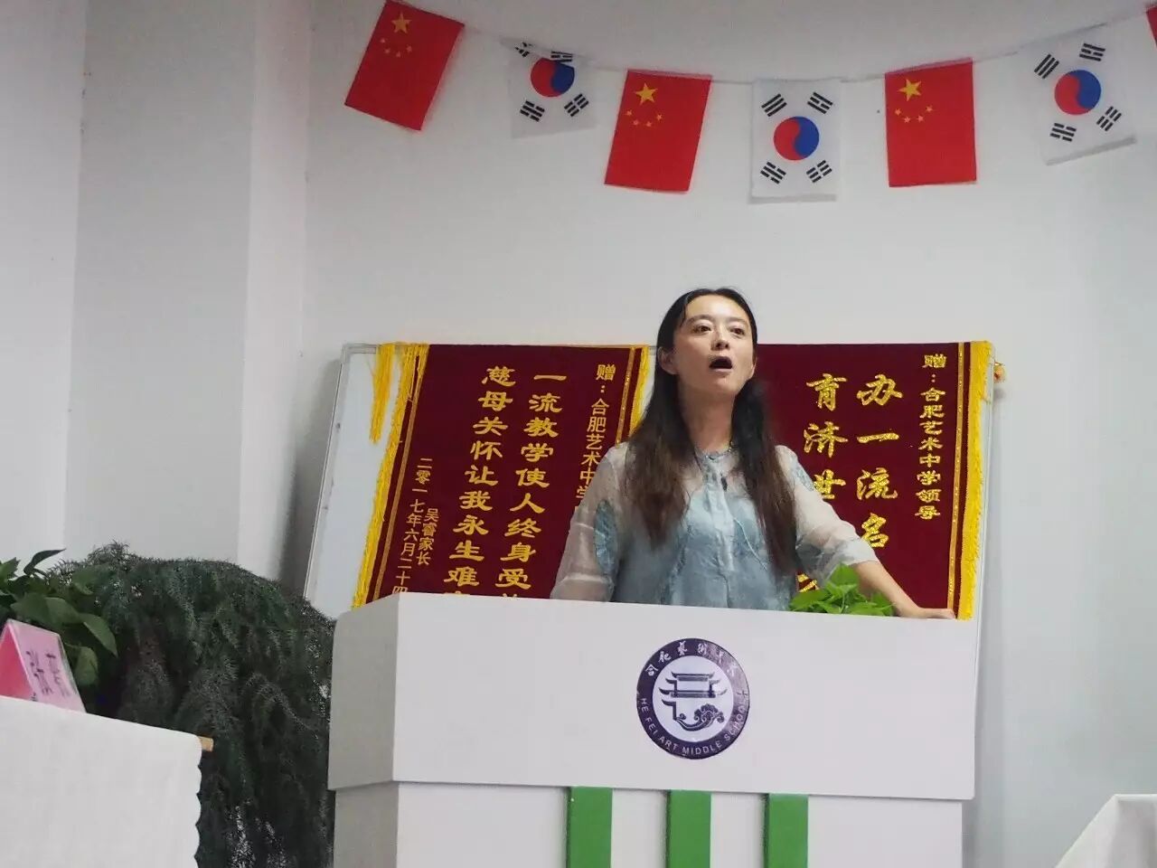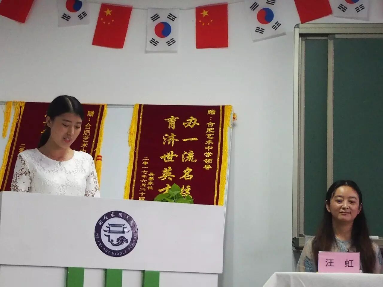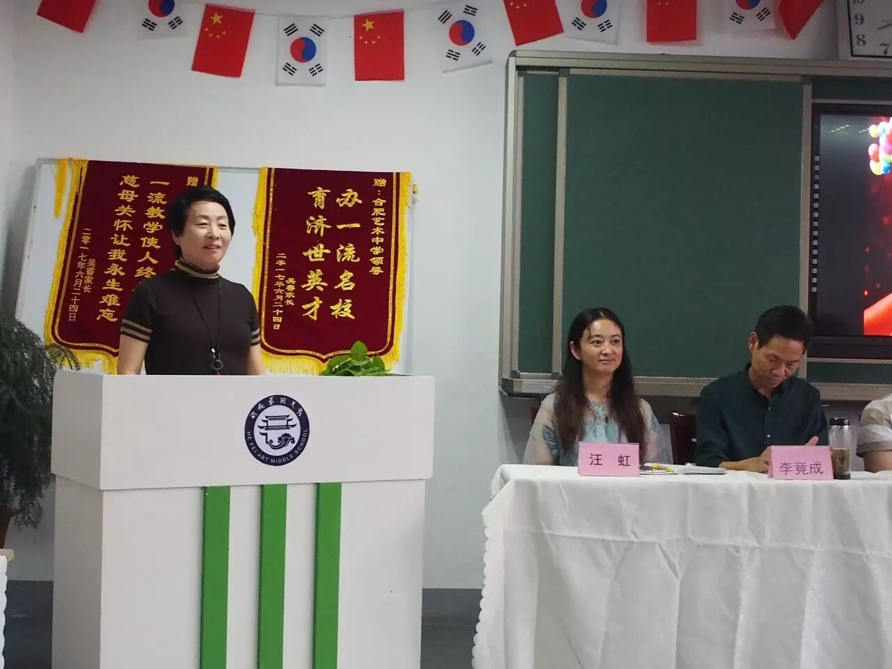 中韩教育合肥艺术中学中心校校长汪虹女士为2017级中韩特色实验班和高尔夫班新生致欢迎词,介绍了合肥艺术中学国际部的特色教育理念、培养目标及办学宗旨,并对新一届的中韩特色实验班和高尔夫班学生提出期望和要求,期望学生们了解学习要求、树立学习目标,把选择赴韩留学的决心化为克服困难的动力、强化学习意识,并祝愿所有新生学业顺利、学业有成。