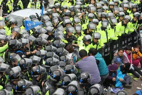 9月7日,在韩国庆尚北道星州郡,民众在“萨德”部署地附近与警方对峙。新华社记者 姚琪琳 摄