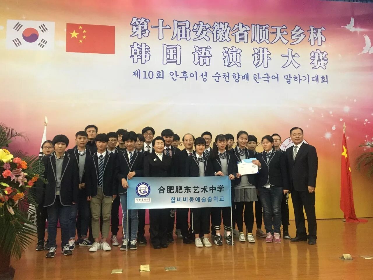 这是合肥艺术中学第二次参加顺天乡杯韩国语演讲大赛。此次中韩特色实验班秦雅美同学通过校级层层选拔,最终代表我校参加了比赛。比赛期间,31位选手围绕韩国的饮食文化、韩流、韩国人的情怀等多方面各施才华。我校秦雅美同学虽然只学习了短短的三个月韩语,但也毫不逊色于各大高校选手。她的演讲题目是《韩国语和我的梦》。她以标准的发音和良好的口语表达能力,得到了在场所有评委老师和观众的大力赞扬。最终荣获大韩韩空奖。