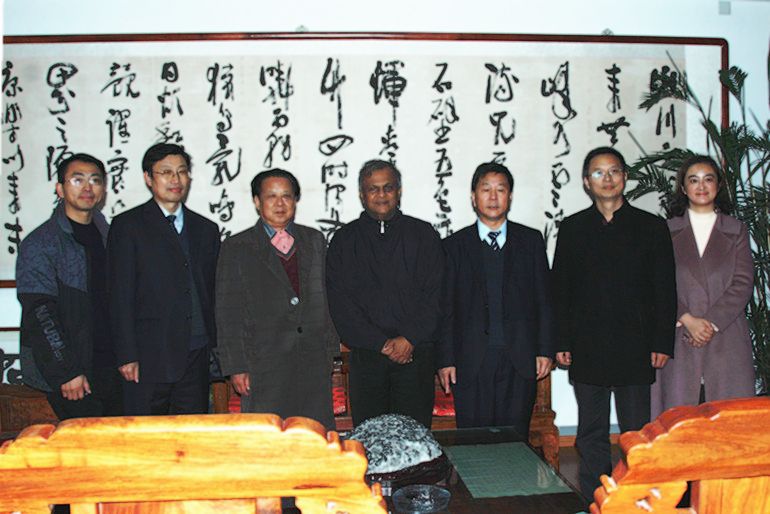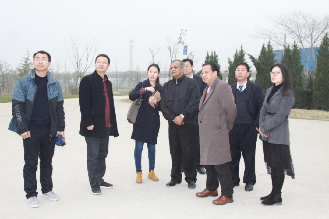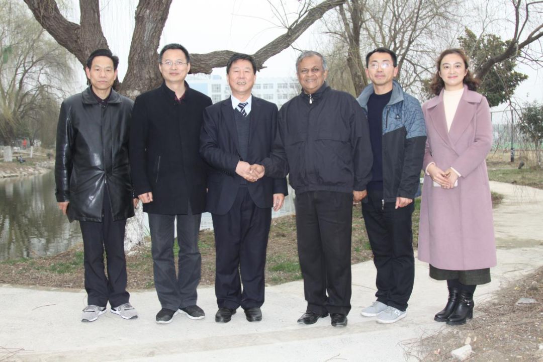 斯里兰卡国际商会会长柯莎乐先生与顾立军参事及陪同参观的王卫东校长等在校园内合影留念。