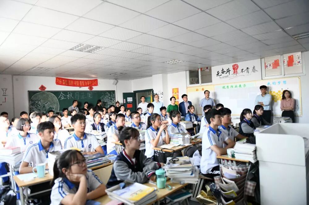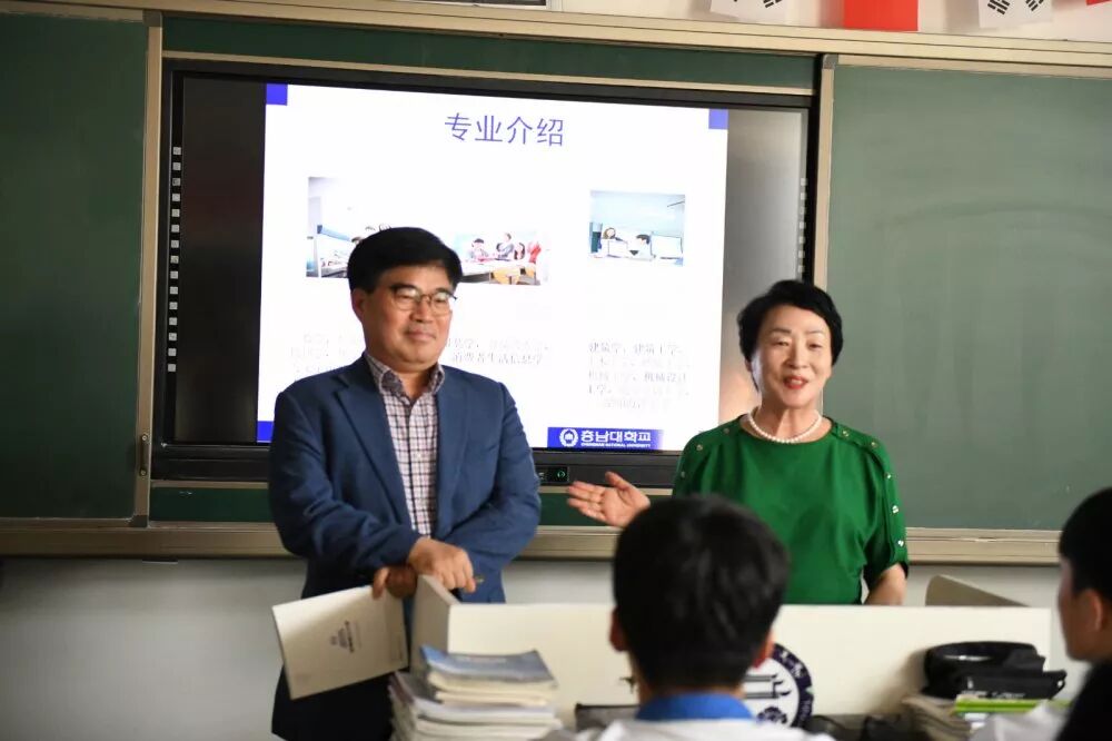 随后,在韩方校长赵诚惠的带领下,韩国忠南国立大学一行走进中韩特色实验班与同学们进行了亲切交流。中韩特色实验班学生于今年4月份访问了忠南大学,受到了李善雨副院长的热情接待,今天在学校再次见到李善雨副院长,倍感亲切。现场忠南大学国际语言学院的老师向同学们介绍了忠南大学的优势专业,也欢迎更多的同学报考忠南大学。